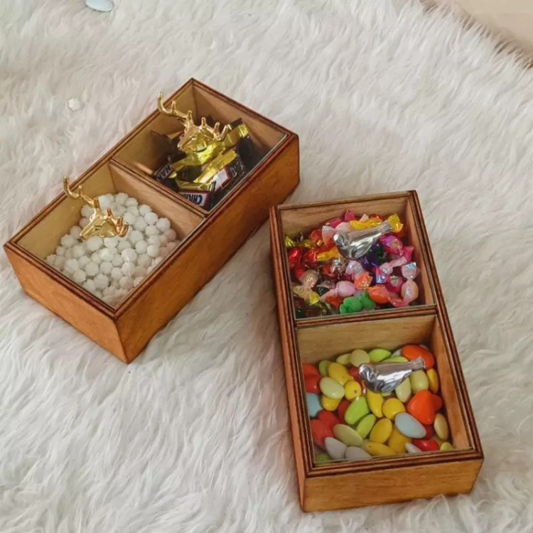 ⚜️قندان مربعی 💥شارژ شد ♦️جنس:چوب روس ✅قابل شستشو👌 ✅️با در شیشه ✅نوع جنس گوزن و جوجه درب تیبک زاماک