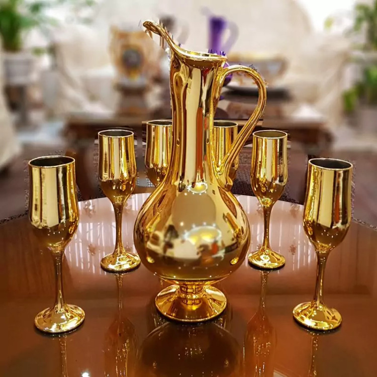 ساخته شده از جنس سرامیک آبکاری شده PVD ضد خش رنگ طلایی شامل تنگ دسته دار و پایه دار 6 عدد لیوان پایه دار مناسب برای پذیرایی و دکور ویترین ظروف دکوری